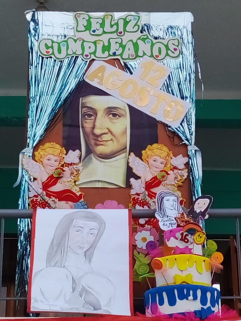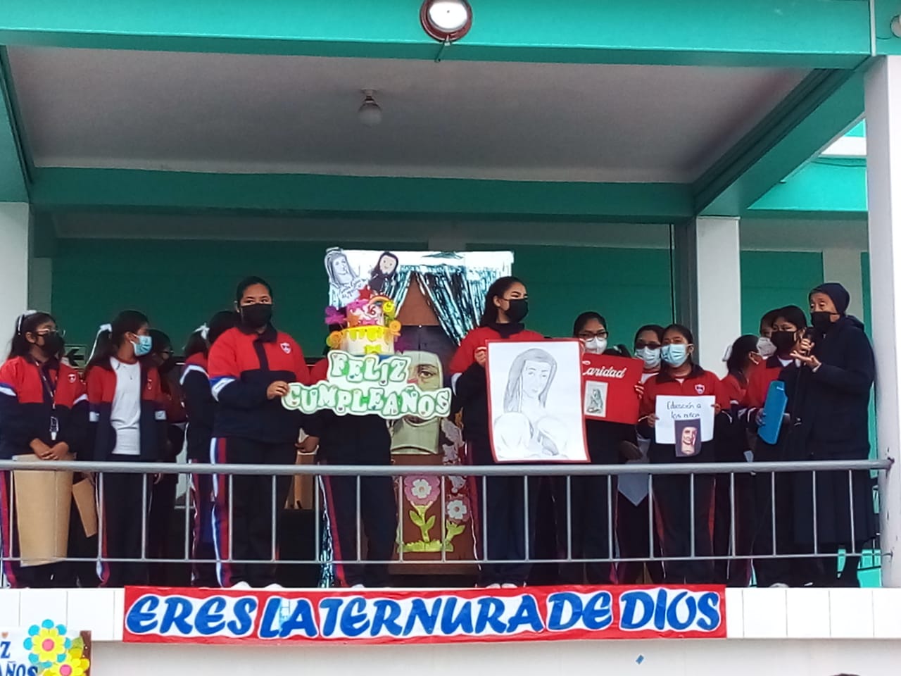 Sor Carmen, nuestra maestra, nos invitó a leer la vida de San Luisa de Marillac, y como el 12 de agosto fue su nacimiento, nos motivó a celebrarlo por primera vez en el colegio y es así como preparamos la oración, los paneles de saludo por cada aula y le cantamos llenas de emoción el happy Birthday to You.